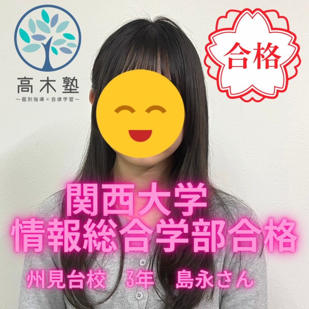 本日は、高木塾の高校3年生が見事、一般入試で関西大学の総合情報学部に合格したので、合格体験記を掲載させていただきます!