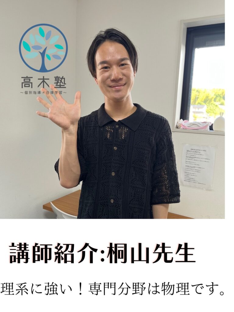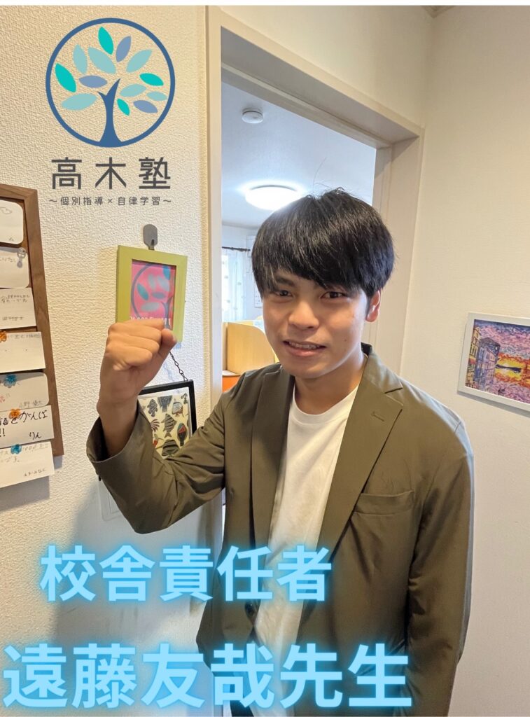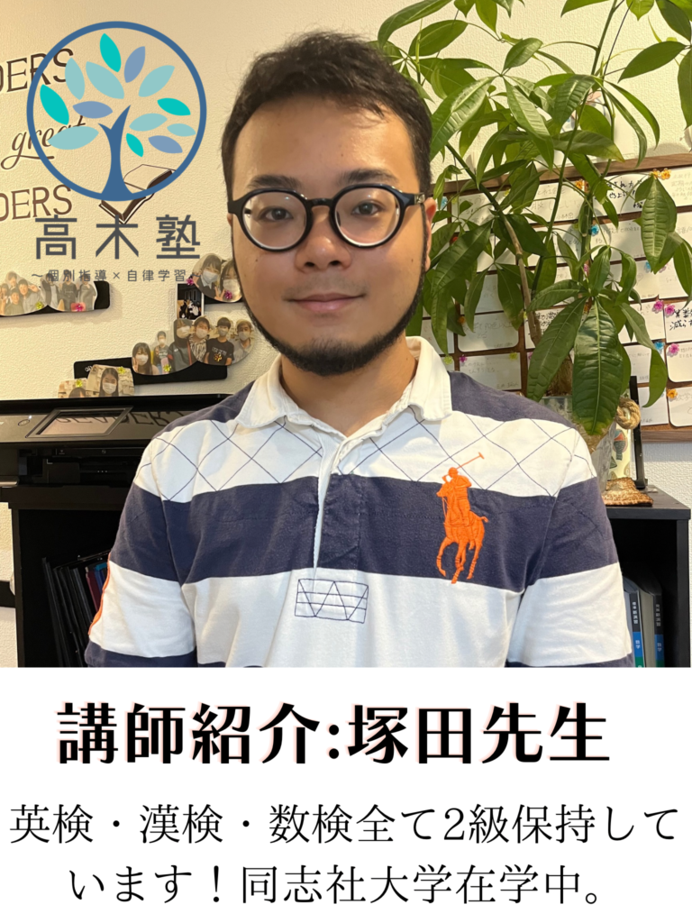 自慢のスタッフ紹介 高木塾では、実際の指導スキルである『ティーチング力』、そして生徒たちの自発性を育て、自律・自立へと導く『コーチング力』、そして生徒たちの目指す進路を叶える為に、今すべきことは何かを的確に指し示し、実行することのできる『コーディネート力』を持ったスタッフの育成に努めています。実際に働くスタッフたちの紹介をこちらでさせていただきます! 高木塾 代表:高木宏章 (関西学院大学出身) 代表 高木宏章 (関西学院大学卒業)得意科目:英語・国語 幼い頃から本を読んだり、新しいものに触れることが好きな性格でした。 大人になっても変わらず、学ぶことって楽しい!と本気で思っています♬ 新たなことを知る喜びや、それによって成長できることを少しでも子どもたちに伝えたいと思い、学習塾を営んでおります。 皆様とお会いできることを楽しみにしております。 資格検定等:中高英語教員免許・TOEIC935・実用英語技能検定(英検)1級・学習心理カウンセラー ●遠藤智哉先生 (龍谷大学理工学部卒業)得意科目:算数・数学・理科・物理 車関係やエンジニアリングに興味があり、龍谷大学の理工学部に入学しました!子どもと関わることが大好きで、高木塾では主に、英語・数学を担当します。幼い頃からサッカーをしており、バイタリティは誰にも負けません! 皆さんと授業でお会いできることを楽しみにしております♪ 平本緑先生 (大阪教育大学卒業) 得意科目:国語・算数・数学・英語 大阪教育大学卒業後、長きにわたりご自身で学習塾を経営されておりました。木津川市・奈良市の子供を中心に学習指導をされてきた先生です。わかりやすい指導とわかるまで徹底的に教える、教育に熱い思いを持った先生です。 平本先生より一言 「生徒のみなさん、はじめまして。 みなさんの中には、「何で勉強しないといけないんだろう?」と思う人がいるかもしれません。 今は面倒だと思うかもしれませんが、努力して得た知識は、荷物にならないし、誰からも奪われません。 その知識を土台に、いろいろな事を深く考えられるようになります。 頑張る皆さんの 少しでもお手伝いできたらうれしいです。 お教室で会ったら、宜しくお願いします。」 ●内薗英一郎先生 (慶應大学→東京理科大学卒業) 得意科目:理科・科学・数学・社会 内薗先生は「慶應大学」文系学部に入学後、理系を学びたいということで「東京理科大学」に入学・卒業されている先生となります。生徒の皆様にメッセージです。 「こんにちは!内薗と申します。私は子どもたちとともに楽しく学びたいと思っています。学問の楽しさや学ぶことの面白さを伝えていければと思います!ちなみに、多趣味ですのでたくさんお話ししましょうね!教室でよろしくお願いします。」 枡田先生(灘高校出身・神戸大学医学部) 高い学力の高木塾自慢の講師です。難関校・灘高校から、神戸大学医学部へと進学したその実力は本物です。理系科目を中心に、生徒一人ひとりの理解度に寄り添った丁寧な指導が持ち味です。 中学時代は野球部に所属し、勉強と部活を両立してきた経験から、時間の使い方やモチベーション維持のコツなど、学力以外の面でも多くのアドバイスをしてくれます。 常に穏やかで、親しみやすく、生徒の悩みにも真摯に耳を傾ける優しい性格。どんな質問にも丁寧に答えてくれる「頼れるお兄さん」のような存在です。 上村優心先生 京都両洋高校→文教大学 得意科目:英語・国語・古典 高校3年生までは生徒として塾に通わせていただいてましたが4月から講師として通わせていただいております上村優心(ウエムラマナト)です! 高校受験や大学受験などを終えてこれまでの自分の経験などを伝え、1人でも多くの生徒さんが勉強を好きになったり志望校への合格を掴み取れるようご指導させていただきます‼︎ 僕自身大学受験期は高木塾でご指導いただき それらがしんどい受験期のモチベーションUPに 繋がったと感じたので、これからは僕自身が定期テストや受験などのモチベーションであったり、 勉強を継続していってもらえるよう生徒さんと 日々の授業時間など大切にし励んでいきたいと思っておりますのでこれからどうぞよろしくお願いします‼︎ 塾長コメント:文面からも分かるように責任感の強い、良い先生です。塾生から講師となり、心強い存在です。生徒の皆様は沢山話してくださいね。 桐山先生 木津南中学校→龍谷大学付属平安高校→龍谷大学 得意科目:理科・物理・力学・英語・数学 桐山先生は理系が得意な先生です!5月より入職致しました。 中学生時代はとても勉強が苦手だった桐山先生。高校で勉強に目覚めて学ぶことが好きになったそうです。 勉強が好きな現在の視点と、苦手だった頃の視点、両方をもち指導できることが強みです。 塾長コメント:明るく元気な桐山先生に是非みなさん会いに来てください! 増田先生 大阪公立大学在学中 増田先生は文系理系問わず、高いレベルで指導ができる先