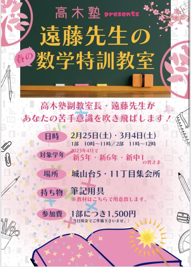 新中学1年生・新小学5・6年生を対象に期間限定で、数学特訓教室を開講することを決定いたしました!