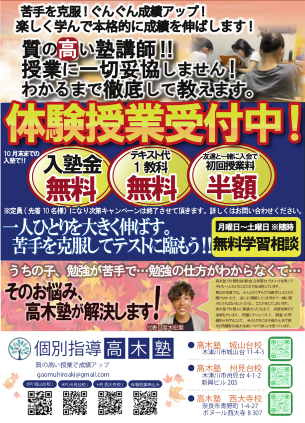高木塾では、2学期初旬の今!秋の入塾キャンペーンを実施致します。