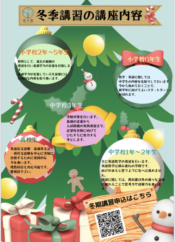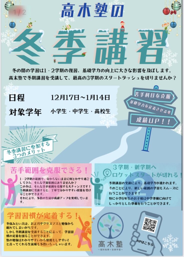 高木塾では、冬期講習を12月17日〜1月14日にかけて実施させて頂きます。